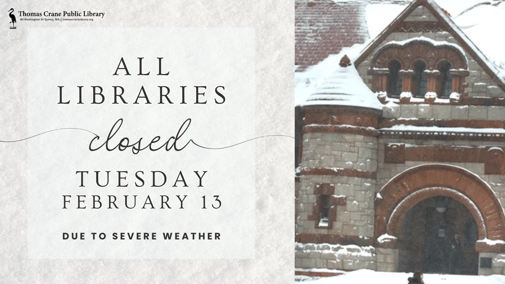 All Quincy Libraries will be CLOSED Tuesday, February 13 due to severe weather. Stay warm and safe, everyone!
