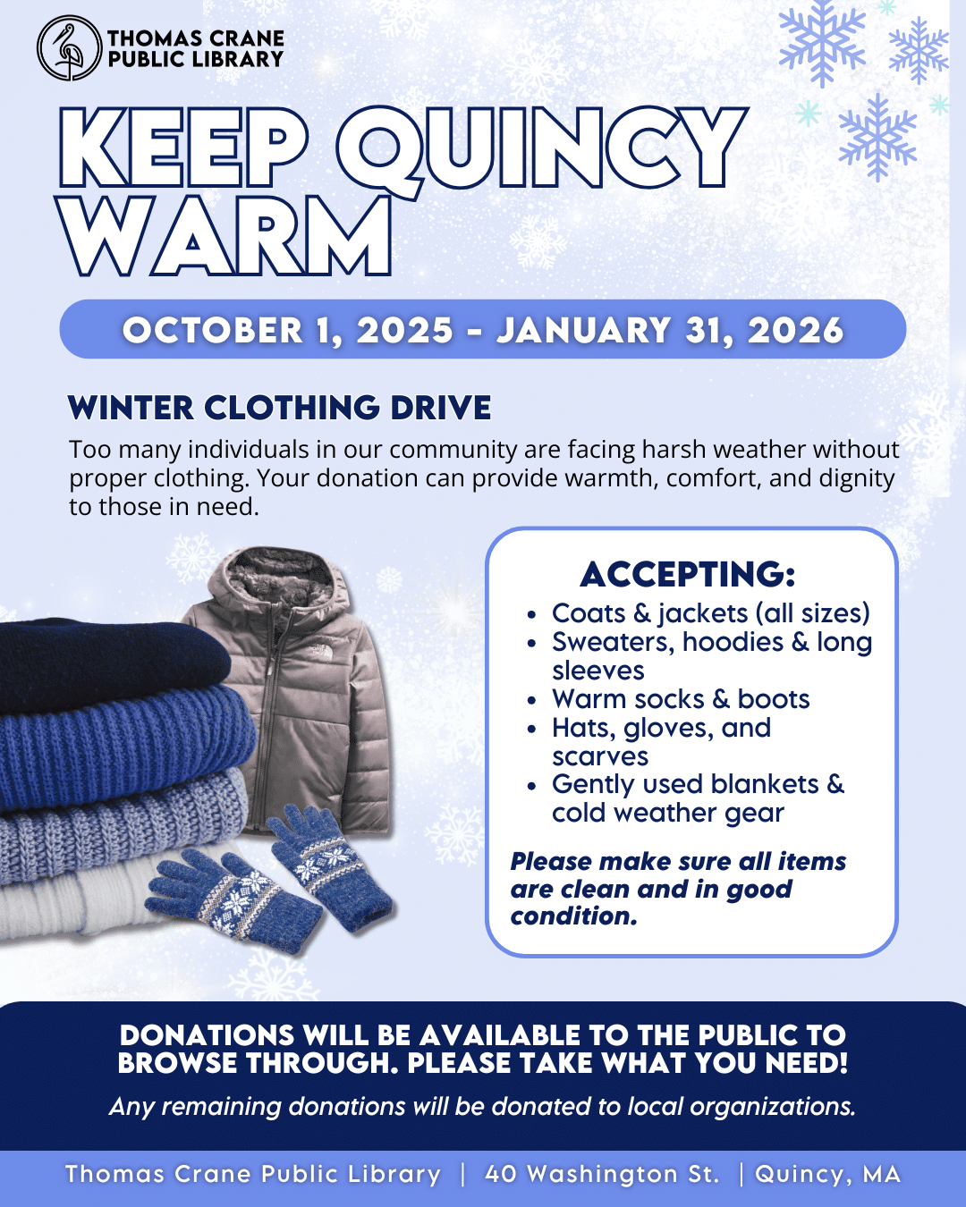 Help us #KeepQuincyWarm this Winter! Too many individuals in our community are facing harsh weather without proper clothing. Donate your gently used winter clothing between October 1, 2025 until January 31, 2026 at the Main Library in Quincy Center at 40 Washington St. Your donation can provide warmth, comfort, and dignity to those in need.