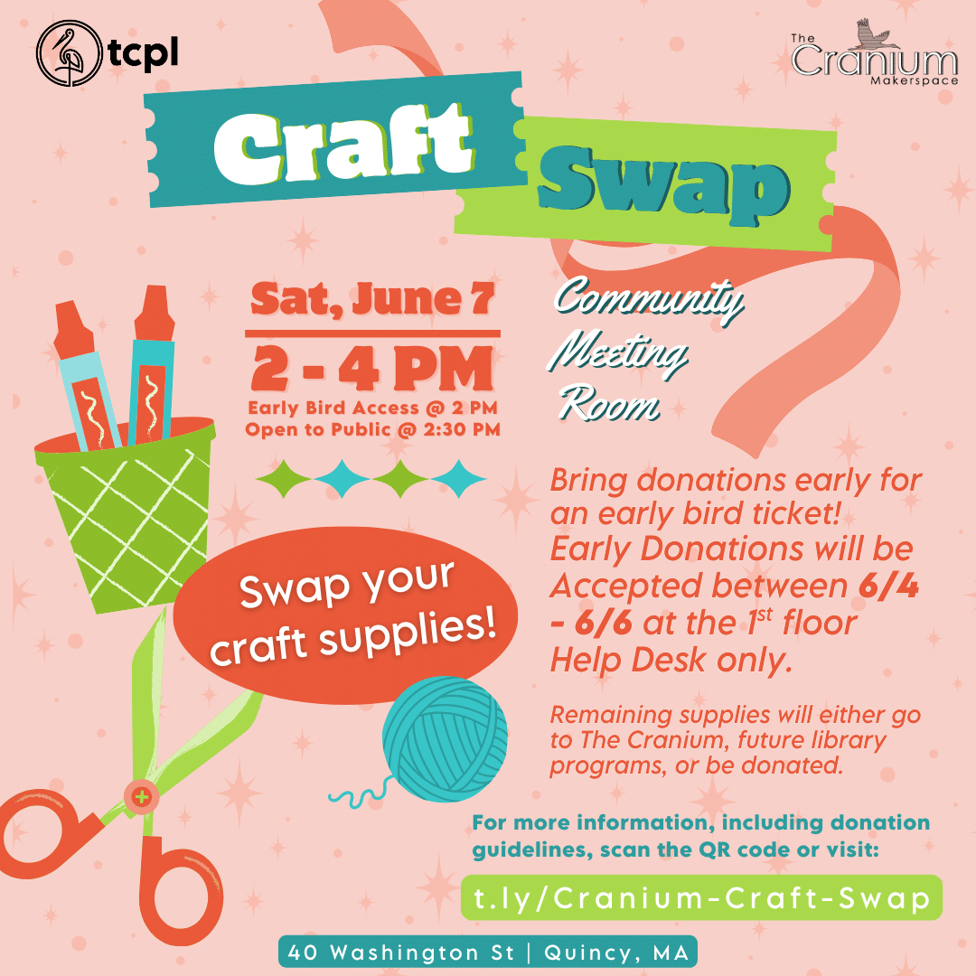 Join us to swap your craft supplies in time for the end of Spring cleaning and Summer fun!