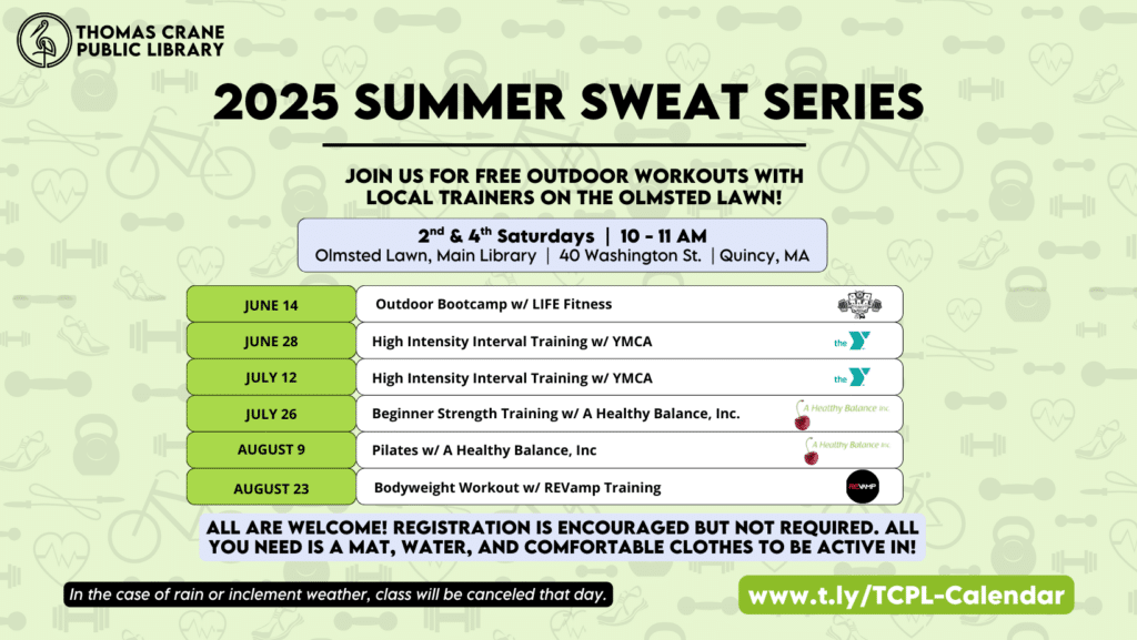 The Summer Sweat Series at the Thomas Crane Public Library invites local trainers for FREE hour-long workout sessions on the Olmsted Lawn every 2nd and 4th Saturdays all Summer, June to August 2025!