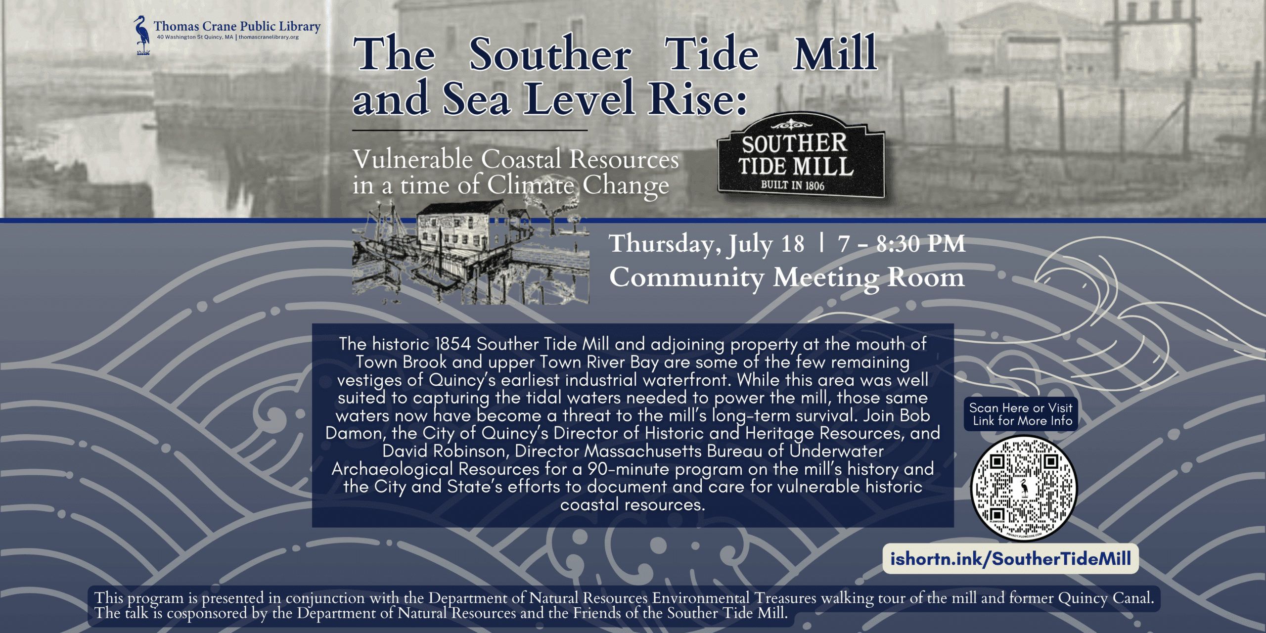 This program is presented in conjunction with the Department of Natural Resources Environmental Treasures walking tour (registration required for tour) of the mill and former Quincy Canal (date TBD). The talk is cosponsored by the Department of Natural Resources and the Friends of the Souther Tide Mill.