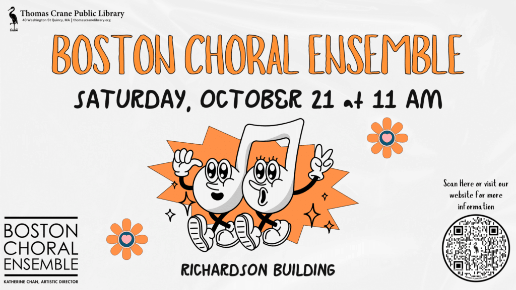 First, on Saturday, Oct. 21 at 11 AM, the library will host the Boston Choral Ensemble for a 30-minute, family-friendly program that will feature joyful music from diverse global cultures from around the world that have become part of the fabric and community of Greater Boston. The performance will include “Kalinda,” performed in Haitian Creole; “Balelaikka,” a Tamil tongue-twister from India; “Salseo,” a Venezuelan song with a salsa beat; and the stirring “Song for the People” by Melissa Dunphy. Led by their Artistic Director, Katherine Chan, the Boston Choral Ensemble returns to a full season of sharing innovative and engaging musical experiences for audiences in beloved community gathering spaces throughout Boston.
