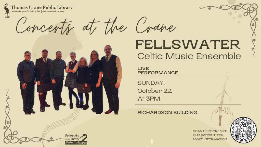 Fellswater has delighted audiences at the New Hampshire Highland Games, Blackstone River Theatre, Boston Celtic Music Fest, The Burren Backroom Series, Club Passim and Colonial Williamsburg. The band was featured at the 2015 Royal Nova Scotia International Tattoo, and performed in the world-renowned Royal Edinburgh Military Tattoo. The group also gave two concerts in the Edinburgh Festival Fringe in August 2018. This performance is made possible by the generous support of the Friends of the Thomas Crane Public Library. Those who would like to watch the Fellswater performance from the comfort of home may do so via a live stream on the Thomas Crane Public Library’s YouTube channel. The performance will also be recorded and aired on a later date by QATV. Concerts at the Crane are generously sponsored by the Friends of the Thomas Crane Public Library.