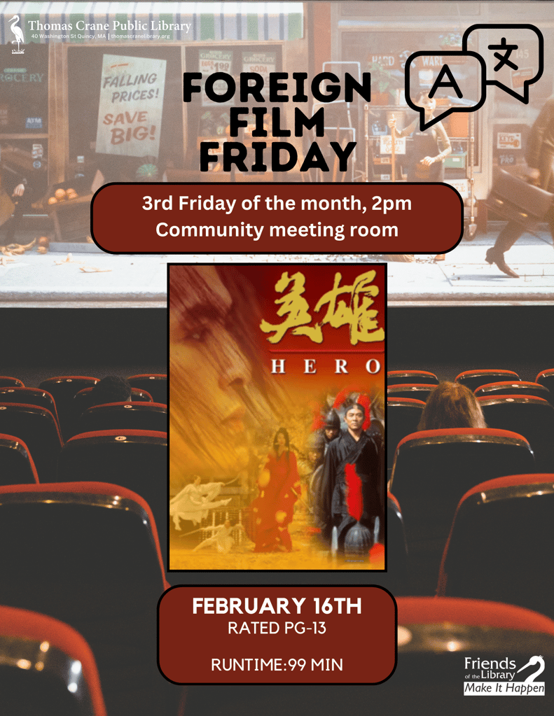 The Thomas Crane Public Library will screen “Hero ( 英雄 )” on Friday, Feb. 16 from 2-4 p.m. in the Main Library’s Community Meeting Room, 40 Washington St.