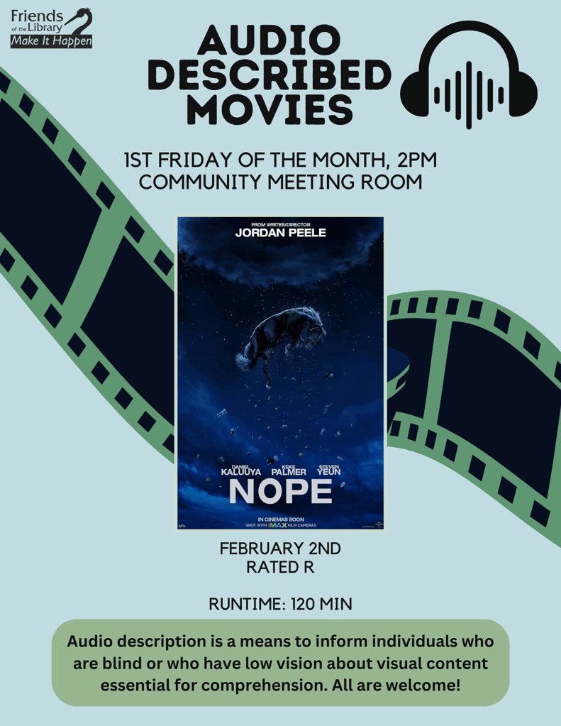 “Nope” is the first movie that will be screened as part of the library’s new Audio Described Movies initiative. Audio description (also referred to as “description” or “video description”) is defined as “the verbal depiction of key visual elements in media and live productions.” Audio description is a means to inform individuals who are blind or who have low vision about visual content essential for comprehension. Audio description of video provides information about actions, characters, scene changes, on-screen text, and other visual content. The audio description of the action or the people or the scenery never interferes with the dialogue spoken by the characters.