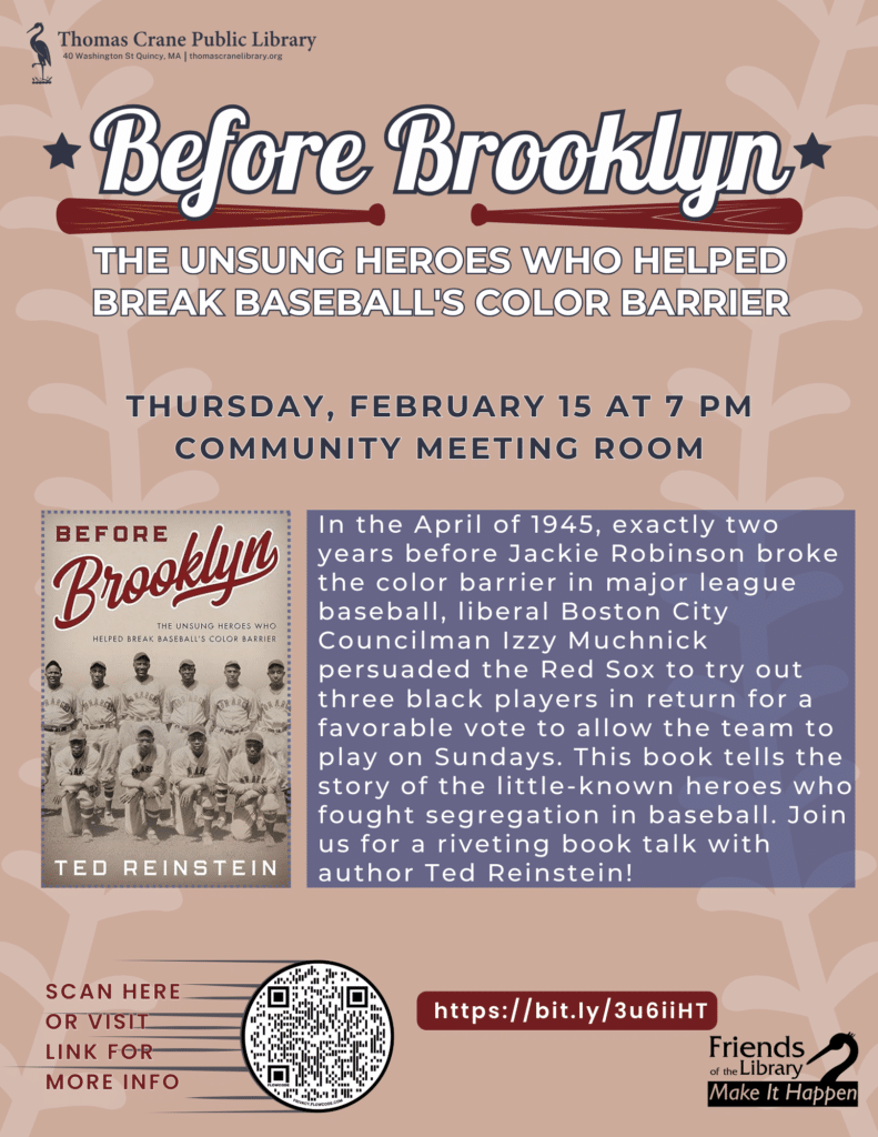 QUINCY — The staff of the Thomas Crane Public Library are proud to host author and reporter Ted Reinstein, who will discuss his new book “Before Brooklyn: The Unsung Heroes Who Helped Break Baseball’s Color Barrier.”